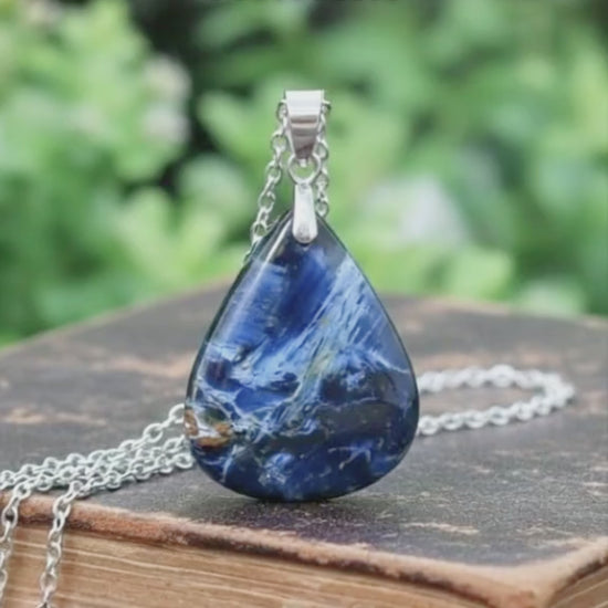 Laissez-vous emporter par les reflets tourbillonnants de ce pendentif en Pietersite, une pierre rare et spectaculaire aux nuances profondes de bleu.