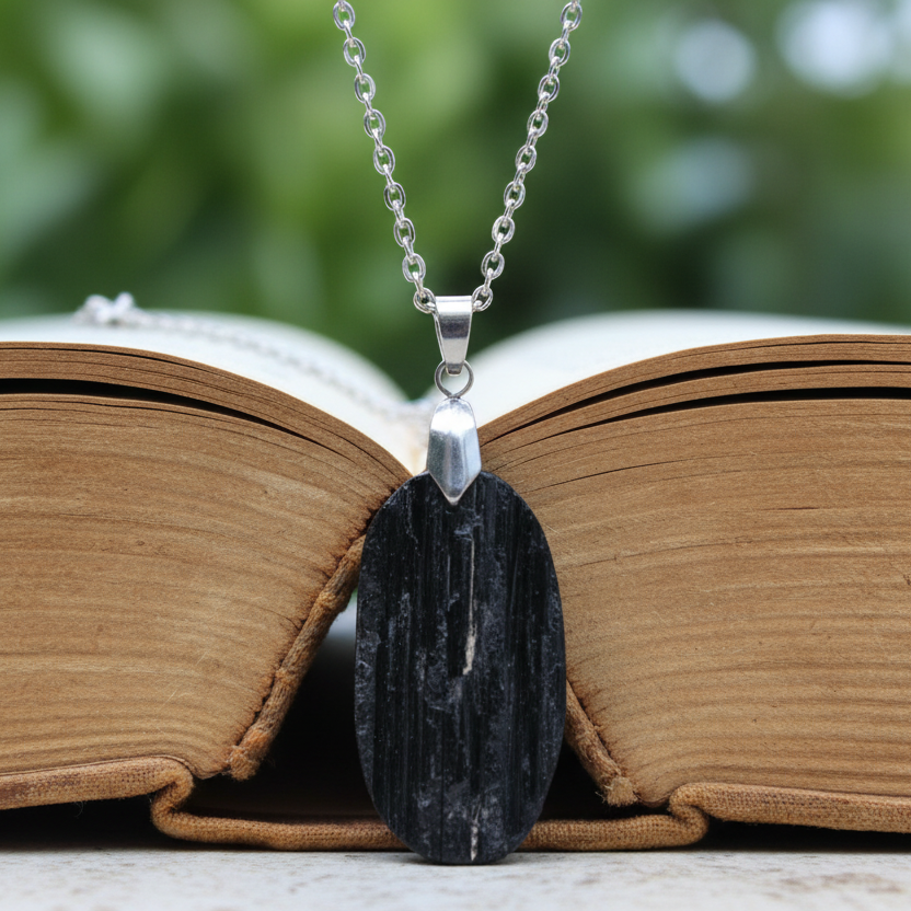 Ce pendentif met en lumière une Tourmaline noire brute ovale, conservée dans son état naturel pour révéler ses stries cristallines et son aspect minéral authentique.