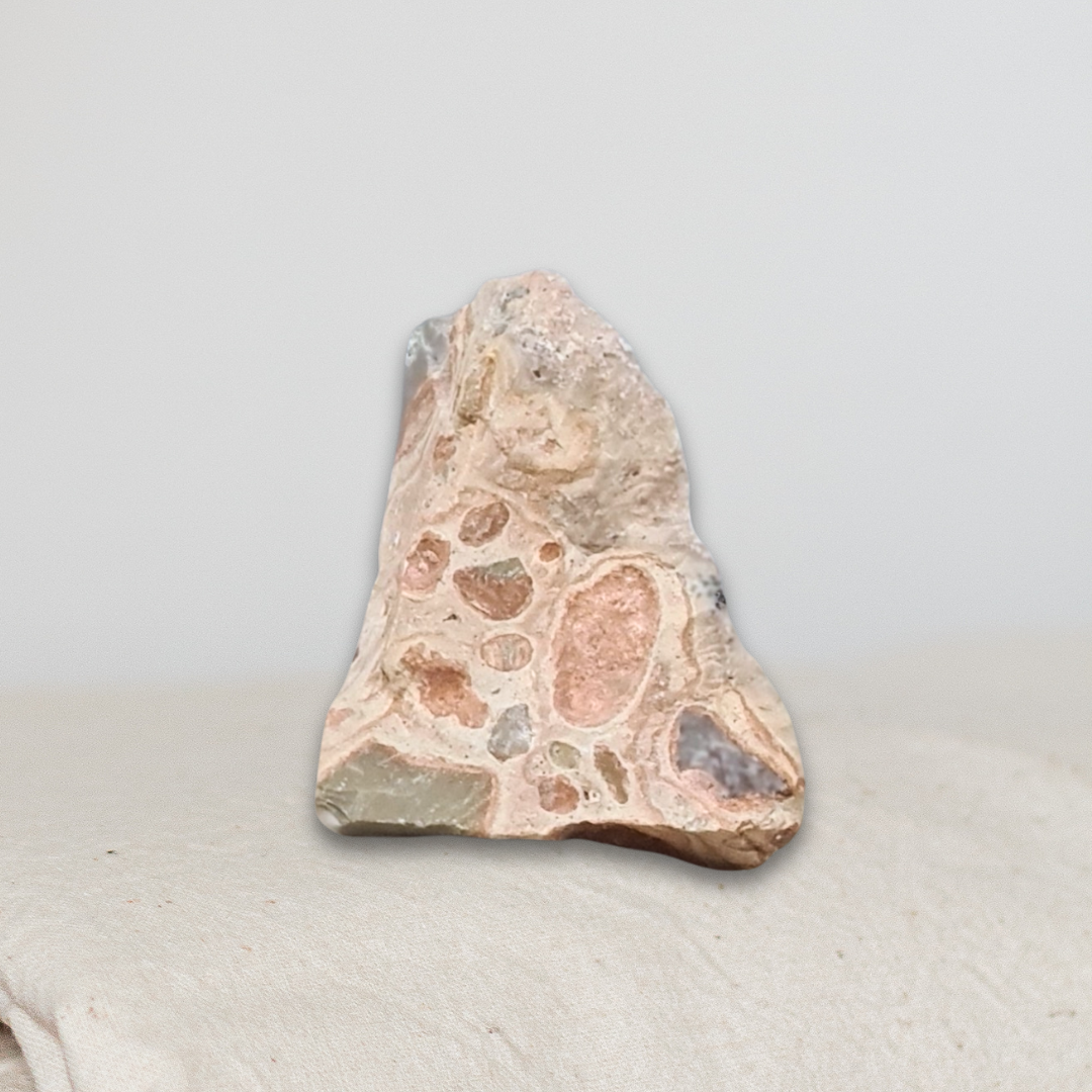 Chaque pièce est unique, présentant une combinaison harmonieuse de tons bruns, verts, ocres et beiges, formés par le refroidissement de laves riches en silice.