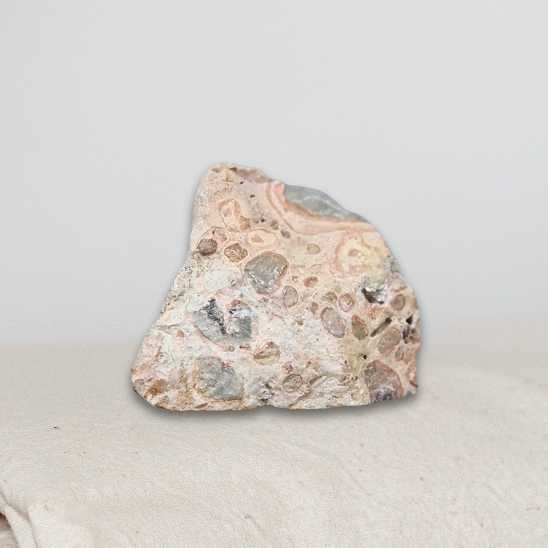 Cette Rhyolite Léopard brute du Mexique séduit par ses motifs naturels tachetés rappelant la robe d’un léopard.